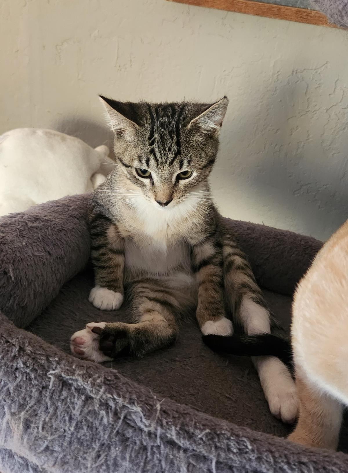 Chip and his siblings were removed from a hoarding situation by a local shelter who then reached out to us as they only take dogs. Chip is a sweet, shy kitten who will need a patient owner where he feels safe and loved. They will be ready for adoption in late November.